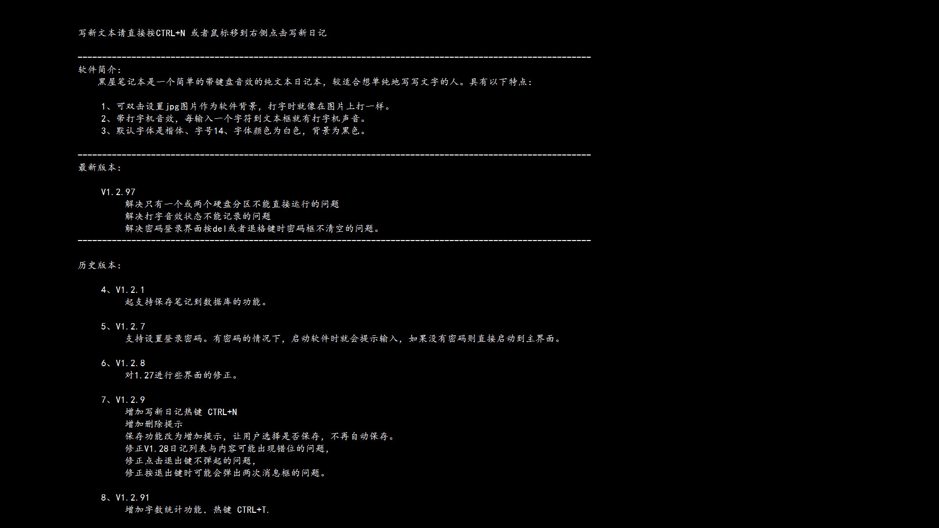 黑屋笔记本是一款简单易用的笔记本软件,这款笔记本软件无需要新建文本,每输入一个字符到文本框即播放打字机音效文件,具有使用打字机的感觉,文本背景可透明而且可以自己设置。