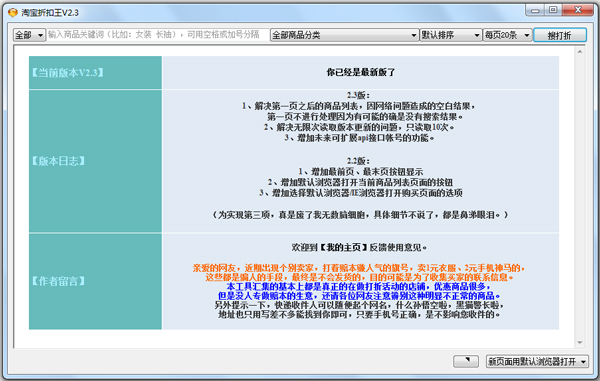 淘宝折扣王是一款非常实用的淘宝打折软件。这款软件并不涉及金钱的提取,它只是可以搜索出打折的商品,直接将价钱降下来,每页最多可以显示100条,搜索结果链接可以直接打开浏览器,非常方便。