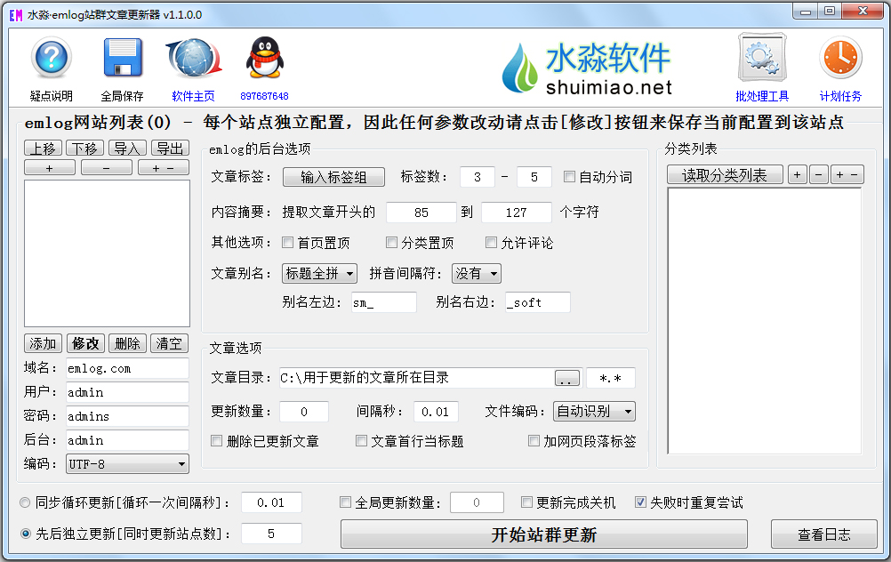水淼emlog站群文章更新器,水淼软件出品的一款给emlog站群自动更新文章的软件。可以同时将一批文章自动更新到多个emlog。支持多分类随机每篇文章单独指定分类。
