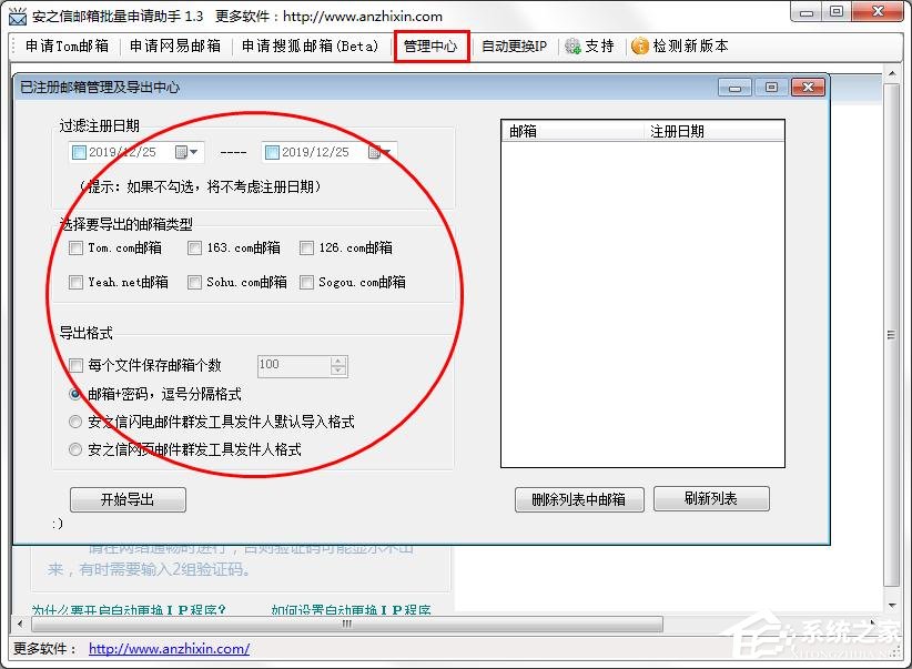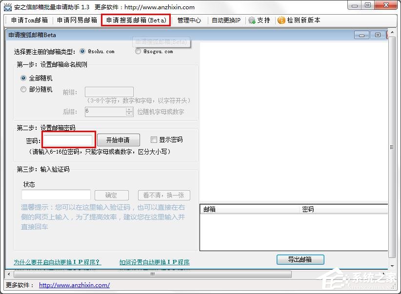 安之信邮箱批量申请助手是一款可以批量申请邮箱的软件,支持网易、搜狐、Tom等多款目前主流的邮箱,支持自动更换IP功能,帮助您快速申请大量的邮箱,还可以与安之心邮箱群发软件整合,让您的邮件营销工作变得更轻松。