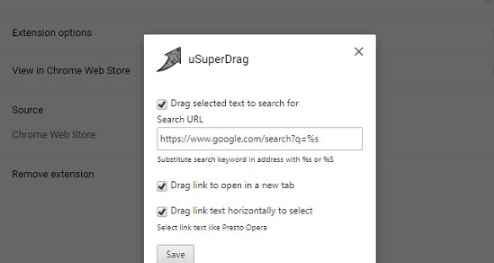 uSuperDrag是一款非常好用的Chrome浏览器扩展程序。能帮助用户在浏览器上通过拖拽的形式快速搜索内容,插件提供直接超级拖拽的功能,帮助用户省去复制粘贴再搜索的复杂流畅,简化操作,大幅度提升用户的使用效率。