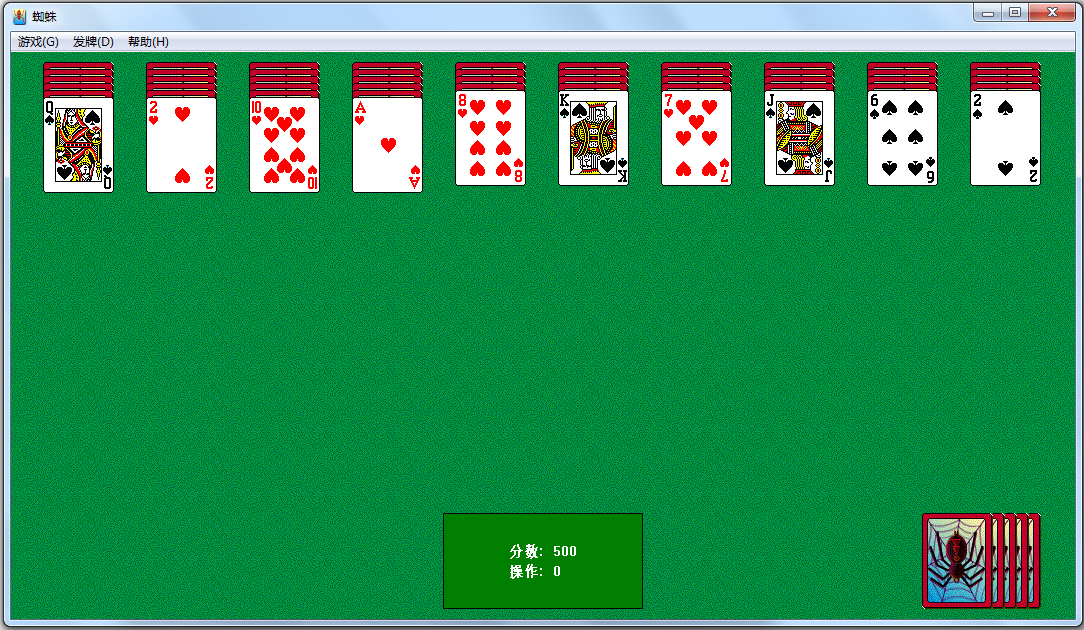 spider.exe是Windows自带的蜘蛛纸牌游戏,总共包含了初级单色、中级双色以及高级四色三种游戏难度,玩家需要用最少的移动次数将牌面中的十叠牌以及待发的五组,共计八副牌整理移除。