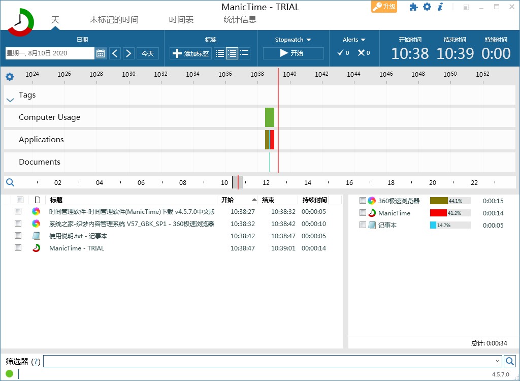 ManicTime是一款数据收集软件,装在您的计算机上可以很准确的计算出你做每一项事情所花的时间,也可以计算出你离开的时间,比如,你离开计算机出去吃饭了,你离开多久,它就能计算出多久,使用起来很方便。
