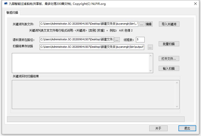 九眼智能过滤系统是一款智能过滤软件,功能全面,适用广泛,用户使用时可以快速实时的对文件进行过滤,首先需要编辑需要过滤的关键词,设置语料源路径和扫描结果存放路径,点击扫描即可,界面简洁,易于操作。