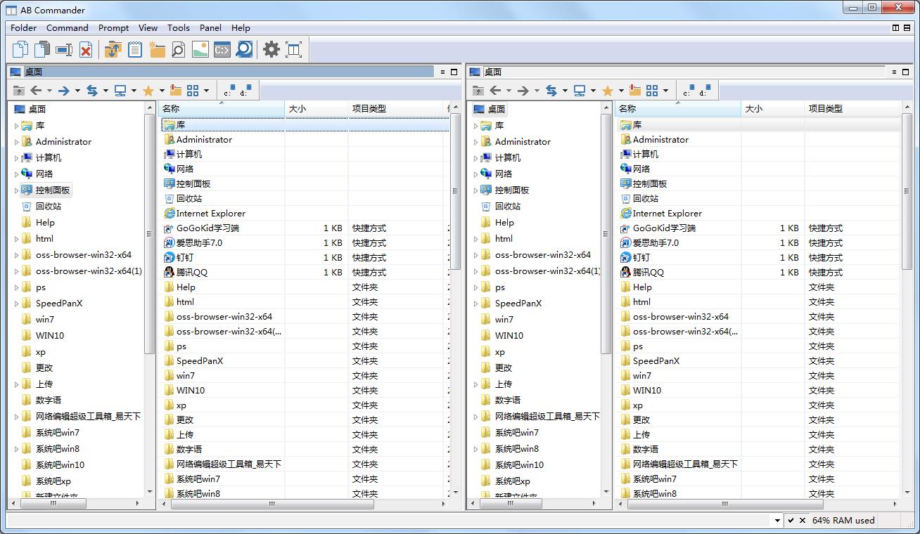 AB Commander是一个可以替代Windows资源管理器的多窗口文件管理器。使用它可以在两个并排的窗口中同时对两个不同的文件夹进行快速有效的操作。AB Commander 提供了丰富的文件管理工具,比如命令行,命令和过滤,比较和文件夹内容同步等。同时还内置了功能强大的快速文本编辑器,图像浏览器等等,可以有效的提高文件管理效率。AB Commander 容易使用,其操作方法与Windows资源管理器和Total Commander等基本一致。
