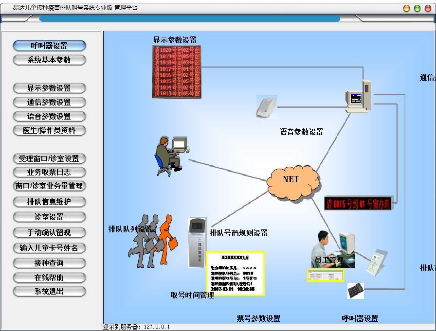 易达儿童接种疫苗排队叫号系统是一款儿童疫苗接种排队叫号管理软件,包含了呼叫器设置、系统基本设置、票号打印参数、显示参数设置、通信参数设置、语音参数设置、医生或者操作员资料等主要功能模块,接种人只要取一个号码,就能实现从预检,登记,接种流程管理,十分方便,实现一号从开始到结束管理。