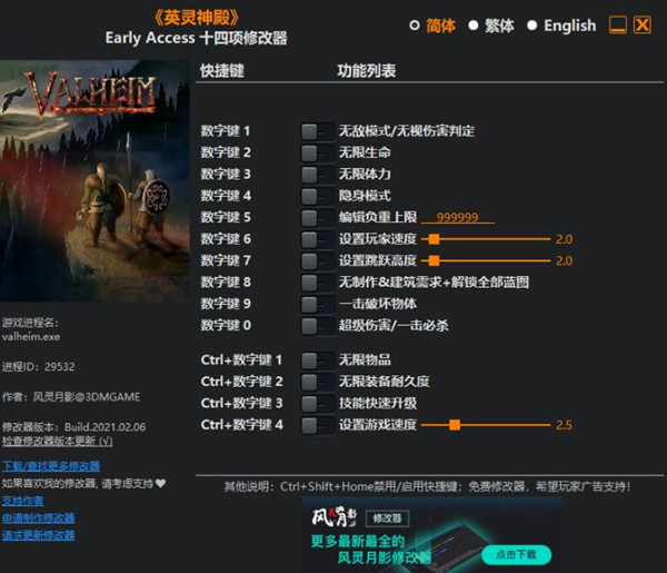 英灵神殿Early Access十四项修改器3DM版是由风灵月影大神制作的最新英灵神殿的多功能修改器工具。有了这一款修改器,玩家就可以拥有无限体力,无限生命,大大提高玩家的战斗力,部分杀毒软件会提示报毒,请使用前一定关闭杀毒软件。