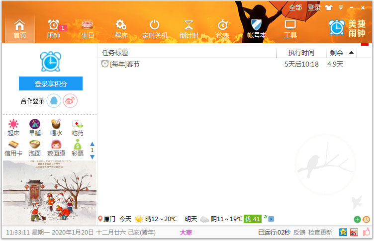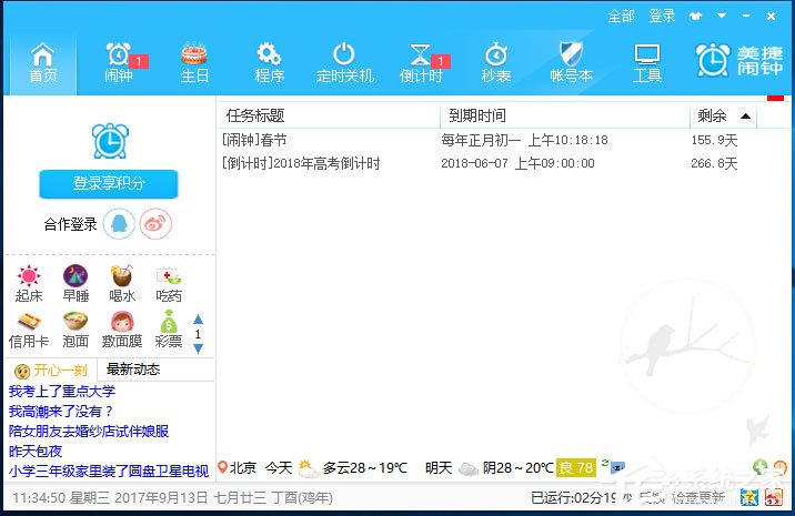 3、美捷闹钟提供了定时闹钟、日程安排、定时执行指定程序、定时关机、定时器、倒计时、计时器、记事本、电脑校时、万年历等功能,是一款小巧但又功能强大的电脑闹钟软件。