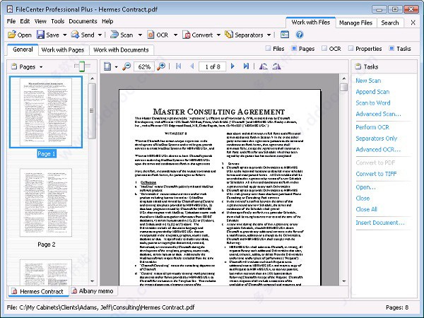 FileCenter作为一个标准的PDF编辑器和查看器。此屏幕显示在FileCenter中打开的PDF。请注意左侧的页面缩略图,这可以轻松导航文件。另请注意底部的文档选项卡。使用选项卡式界面可以同时打开多个文件并快速访问它们。