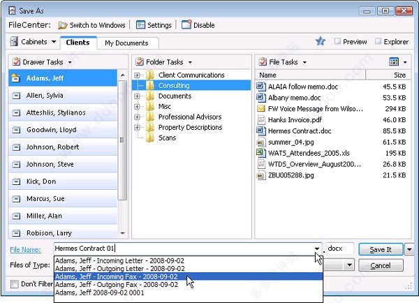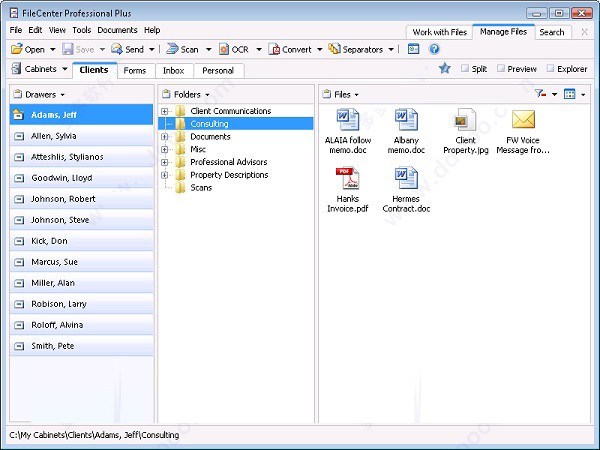 FileCenter文件管理软件具有电子控制台界面,将您的数据组织成抽屉、文件夹和文件,并分为三个视图,便于左右导航。文件可以显示为大图标、小图标、缩略图或细节视图。将FileCenter分开的一个功能是与其他Windows程序的兼容性。我们的文件管理软件将您的文件存储在本机Windows文件夹中,而不是将其锁定在专有数据库中,所以即使您停止使用FileCenter,它们也始终可用于其他程序。