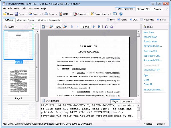 扫描到的文件只是一张图片。要从扫描中获取实际文本,您需要OCR光学字符识别。OCR通过??其形状识别扫描中的字母和字符,为您提供实际的文本来搜索,索引或拉入文字处理器。FileCenter包含内置的OCR。标准版具有基本的OCR引擎,而高级版具有更高精度的OCR引擎,并支持非英文字符。