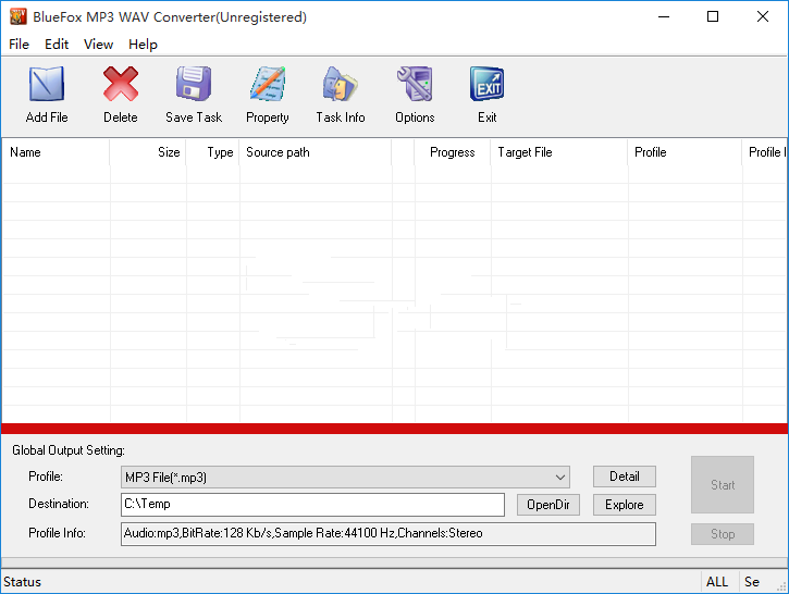 Bluefox MP3 WAV Converter具备了简单直观的操作界面,简单几步即可将各类视频/音频转换为mp3、wav格式。
