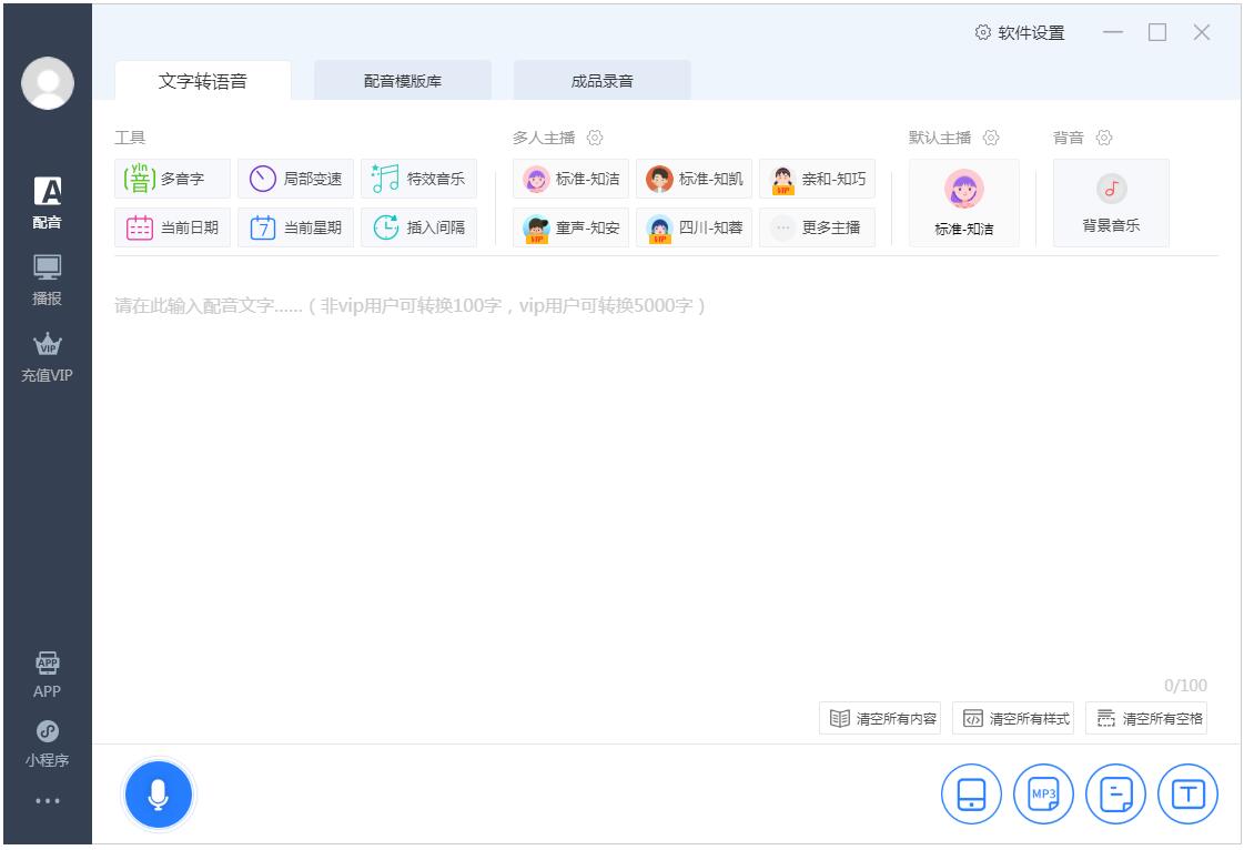 知意配音软件是一款文字转语音,AI语音编辑软件,能很好的帮助用户识别文字,转化为语音,这款软件有着海量主播音效,能够帮助用户轻松制作出各种配音内容,支持背景音调节,多样模板可选,支持特效音。需要的快来下载吧。
