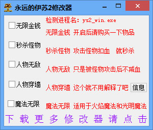 永远的伊苏2修改器是一款简单易用的游戏修改器,永远的伊苏2修改器拥有无限金钱、秒杀怪物、人物无敌、人物穿墙、魔法无限等功能,让你玩游戏的时候有更好的体验!