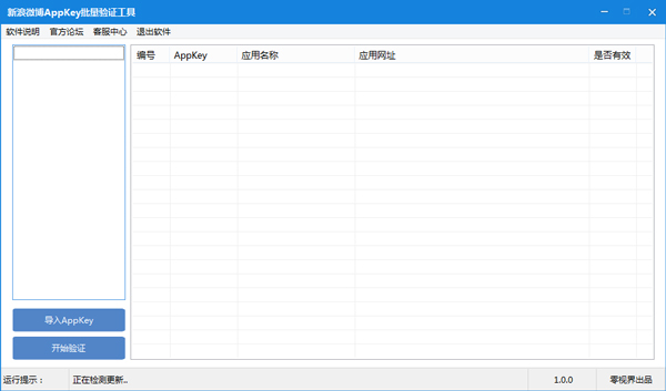 零视界新浪微博AppKey批量验证工具是针对新浪微博第三方开发者而推出的软件,软件可支持批量验证AppKey的真实性、获取对应的应用名称及应用网址等并支持批量导入与导出,本软件完全免费,有需要的朋友们可下载使用。
