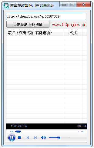 将喝吧主页地址复制到软件中,点击获取下载地址,在歌曲上右键可以复制歌名和下载地址,双击歌曲可以免费试听