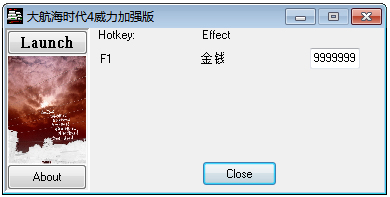 大航海时代4威力加强版金钱修改器,只有金钱功能修改一项,但俗话说有钱能使鬼推磨,这么多钱什么都能买了。