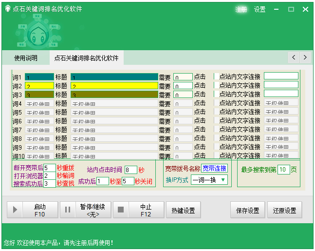 IE浏览器必须升级到8.0或以上版本,之后添加需要提高排名的关键词、需要提高排名的网站或域名、站内二次点击文字或链接,并可根据自己的宽带速度设置点击时间。