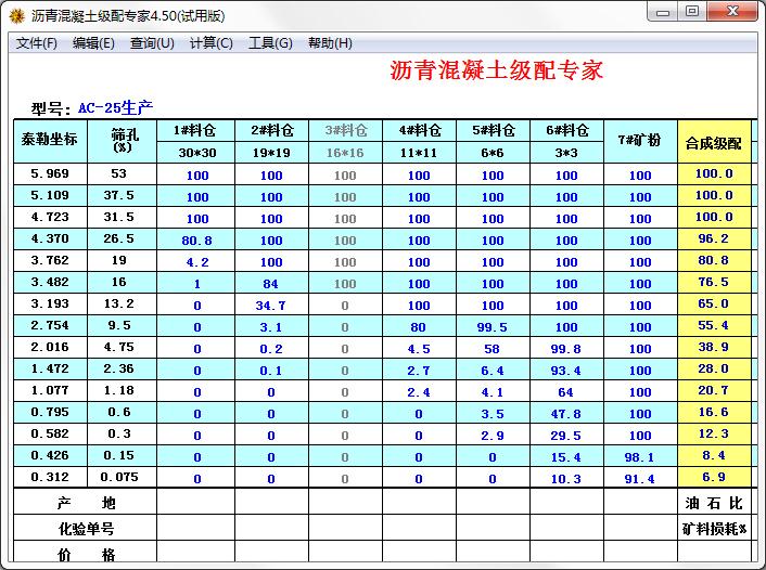 特别当矿料筛分结果不理想情况下,这种偏差更加明显,严重影响质量,本软件精确计算出“矿料配合比”下对应筛孔的重量比“筛孔配合比”,作为自动生产工艺中的实际配方,使得配方和生产一致。这个方法最大好处是对矿料筛分质量要求更低,筛分结果不太合格的矿料也可用于生产。