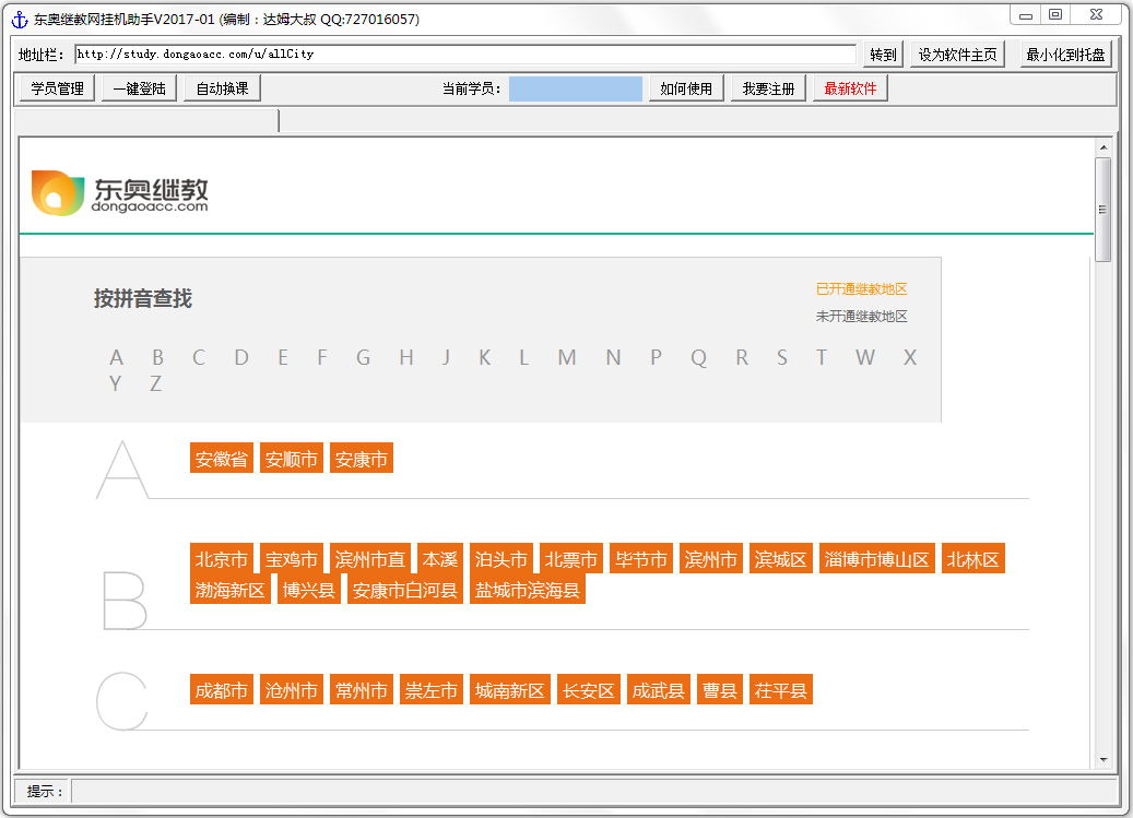 东奥继教网挂机助手可在东奥继教网远程学习时自动换课程学习(各个市在这个网的培训都可用)。若使用IE浏览器在东奥继教网正常学习时课程繁多且学习中间要时不时的回答问题要不然会停止计时。若使用本挂机软件远程学习则软件会自动换课程学习直至你选的课程全学习完。