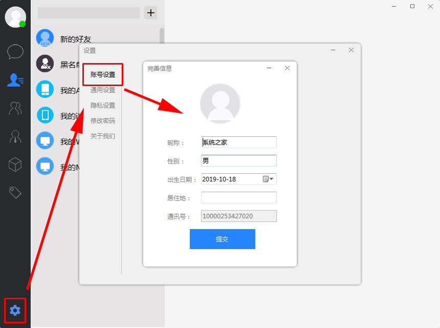 3.设置页面:点击左下角的设置,在账号设置处可以修改自己的个人信息。