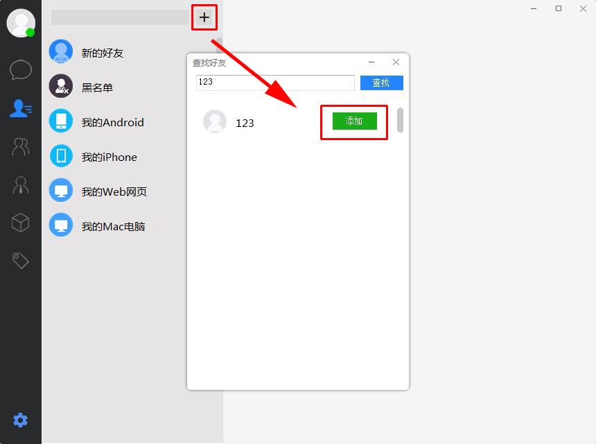 2.添加联系人:只需要点击上方的“+”即可添加联系人,在输入框中输入联系人的ID即可查找到对方。