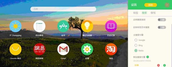 3、点击新标签页中的设置,你可以看到各种设置的选项,可以根据你的一些喜好来设置一些东西,主要有壁纸,搜索设置。如图所示:
