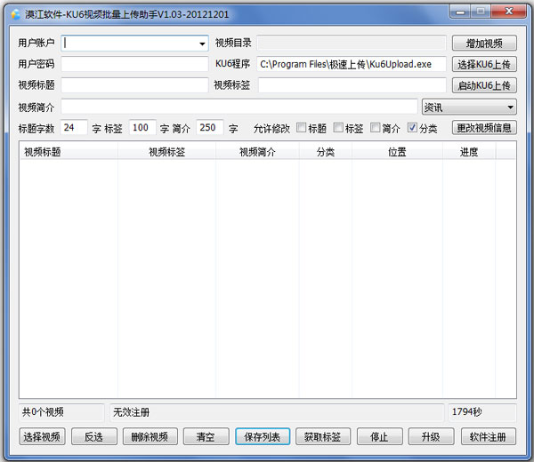 漠江KU6视频批量上传助手是一款专为KU6视频网站设计的视频上传辅助工具,软件不提供上传功能,用户需要安装KU6官方上传软件(http://coolsoft.ku6.com/)。本软件可以批量设置视频的标题、获取标签、简介以及分类,从而实现自动批量上传功能。