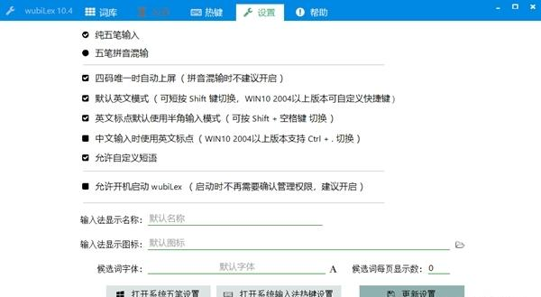 提供系统五笔设置、热键设置快捷入口。