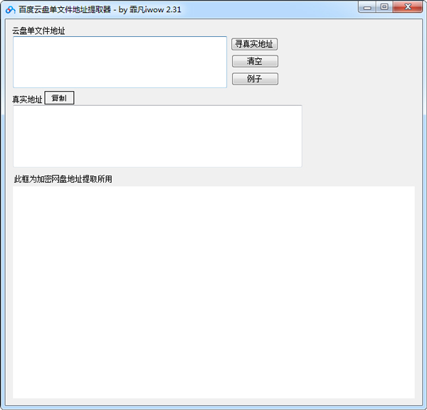 百度云盘单文件地址提取器可以提取百度云网盘单文件真实资源地址,方便我们下载查找。百度云盘单文件地址提取器绿色免安装,操作简单非常简单,一看就会。