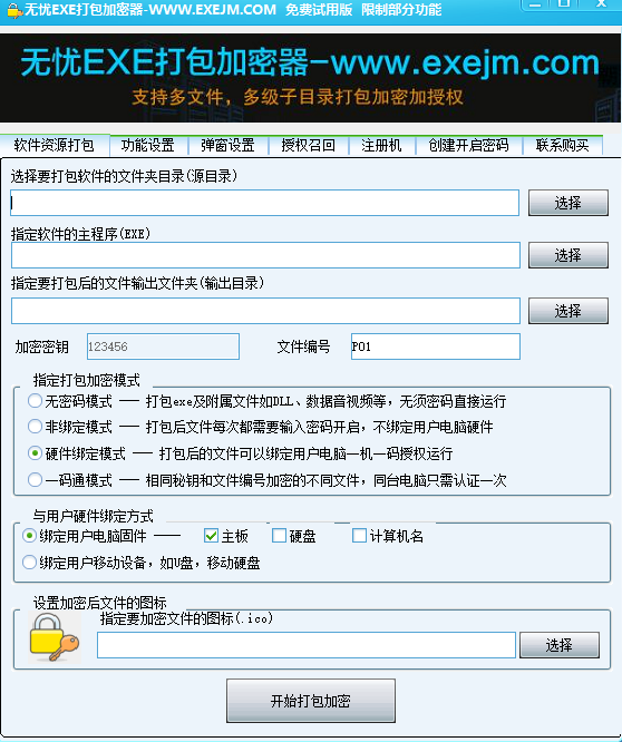 无忧EXE打包加密器是一款非常好用的文件打包加密工具,这款软件操作是很简单的,用户在这可以先选择要打包软件的文件夹目录(源目录)、指定软件的主程序(EXE)以及指定要打包后的文件输出文件夹(输出目录),一键快速设置参数,功能强大,感兴趣的用户快来下载吧!