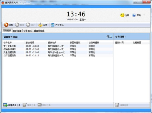 慧声播音大师官方安装版是一款优秀的语音播报软件,慧声播音大师能够支持背景音乐和语音播音的双重随机播放方法,而且慧声播音大师能够自由设置音乐定时播音节目单和语音的定时播音节目单。
