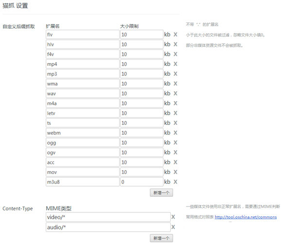 8、此外,猫爪还支持所有音乐网站的音频文件嗅探,包括QQ空间的SWF模块和音乐。在【选项】中,用户还可以自定义设置抓取的视频、音频格式,还支持使用正则表达式定制需抓取的内容。