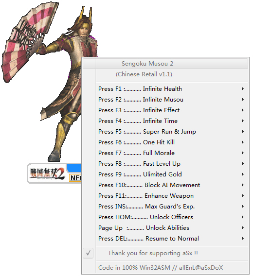 战国无双2修改器是骨灰玩家针对同名游戏而开发的一款游戏辅助工具,简单而又实用。战国无双2修改器拥有无敌、无限无双、无限物效、超级跑跳、一击必杀、快速升级、无限钱、全部技能等14项作弊功能,极大的降低了游戏的难度,提高了玩家的通关胜算,感兴趣的朋友可免费下载战国无双2修改器体验。