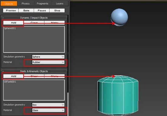 调整完图形材质的摩擦力数值后,就可以单击RayFire的预览功能,观看动画效果。如视频所示,球体在掉落过程中碰撞到圆柱体,沿着圆柱体的斜坡面继续滚动向下,最后碰撞到地面,并在地面滚动。