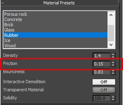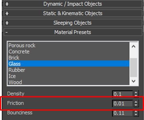如果觉得橡皮、玻璃的摩擦力不够小,还可以在材质预设(Materail Presets)面板中,调低所选材质的摩擦力数值。