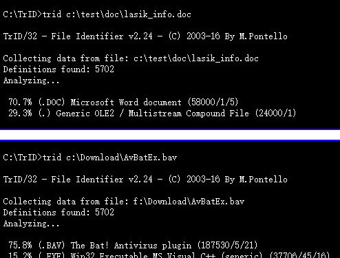 TrID不是根据文件扩展名,而是根据二进制文件特征码识别文件类型。因此,不管你如何更改文件扩展名,用TrID都能识别出来。