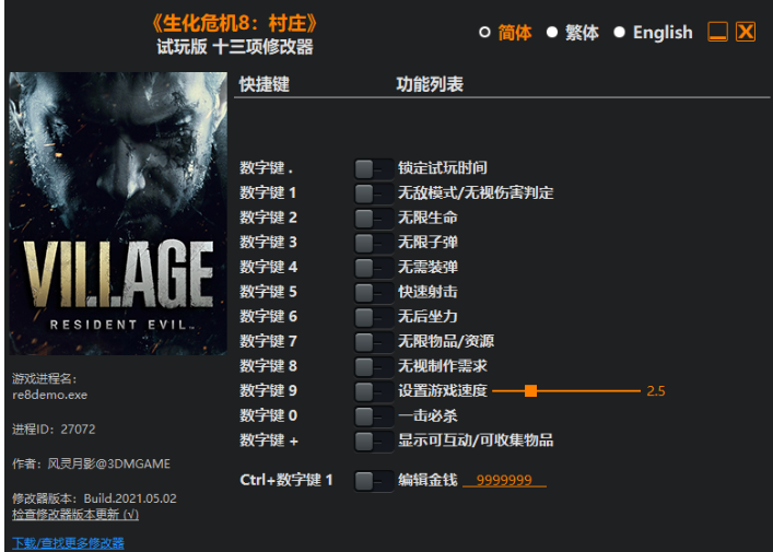 生化危机8村庄风灵月影修改器是一款功能强大的游戏辅助工具,这款辅助工具功能强大,无线生命、子弹、物品,无后坐力、快速装弹等功能这里都有,玩家可以一键设置,能够帮助玩家更加轻松的体验游戏,快来下载体验吧!