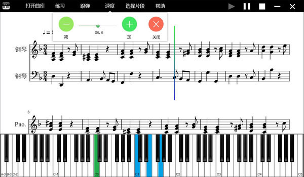 软件包含有一些初学者曲谱,用户可通过打开曲库来打开,如果对曲谱某片段进行练习及跟弹,可通过选择片段来实现,在练习过程中,还可以根据自身条件调整曲谱播放的速度。