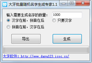 大牙批量随机名字生成专家是一款可以帮助用户随机生成名字的工具,软件使用方便,操作简单,是用户生成随机名字的得力帮手。