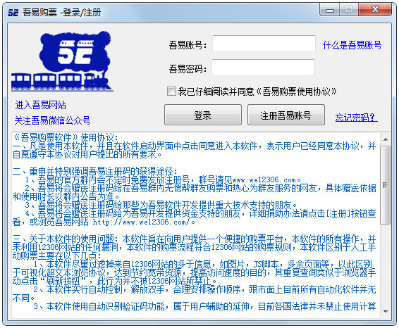 将下载好的吾易文件包解压后,点开“吾易购票”主程序(有时会出现缺少某某文件,这种可能是由于软件某个文件被杀毒软件移除,可以尝试重新解压覆盖,并加信任),当打开吾易购票登陆界面后,输入吾易购票帐号,同意吾易购票所有相关协议后即可进入软件,不同意则退出吾易购票助手。