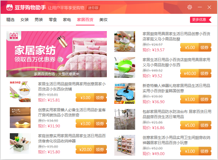 豆芽购物助手顾名思义就是一款帮助你购物的软件,该购物助手能随时了解优惠活动,而且还能快速选择自己需要的产品,因此需要的朋友赶紧下载吧!