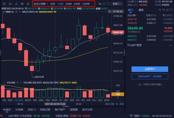 2、通过上方的时间,我们可以调整时间段的涨跌图柱,比如5分钟一个图柱,10分钟一个图柱等等。