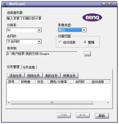 在客户端只要安装NetScan的客户端程序,安装好后点击菜单“开始→程序→BenQ NetScan→使用扫描仪”,然后在打开的界面上来进行设置:
