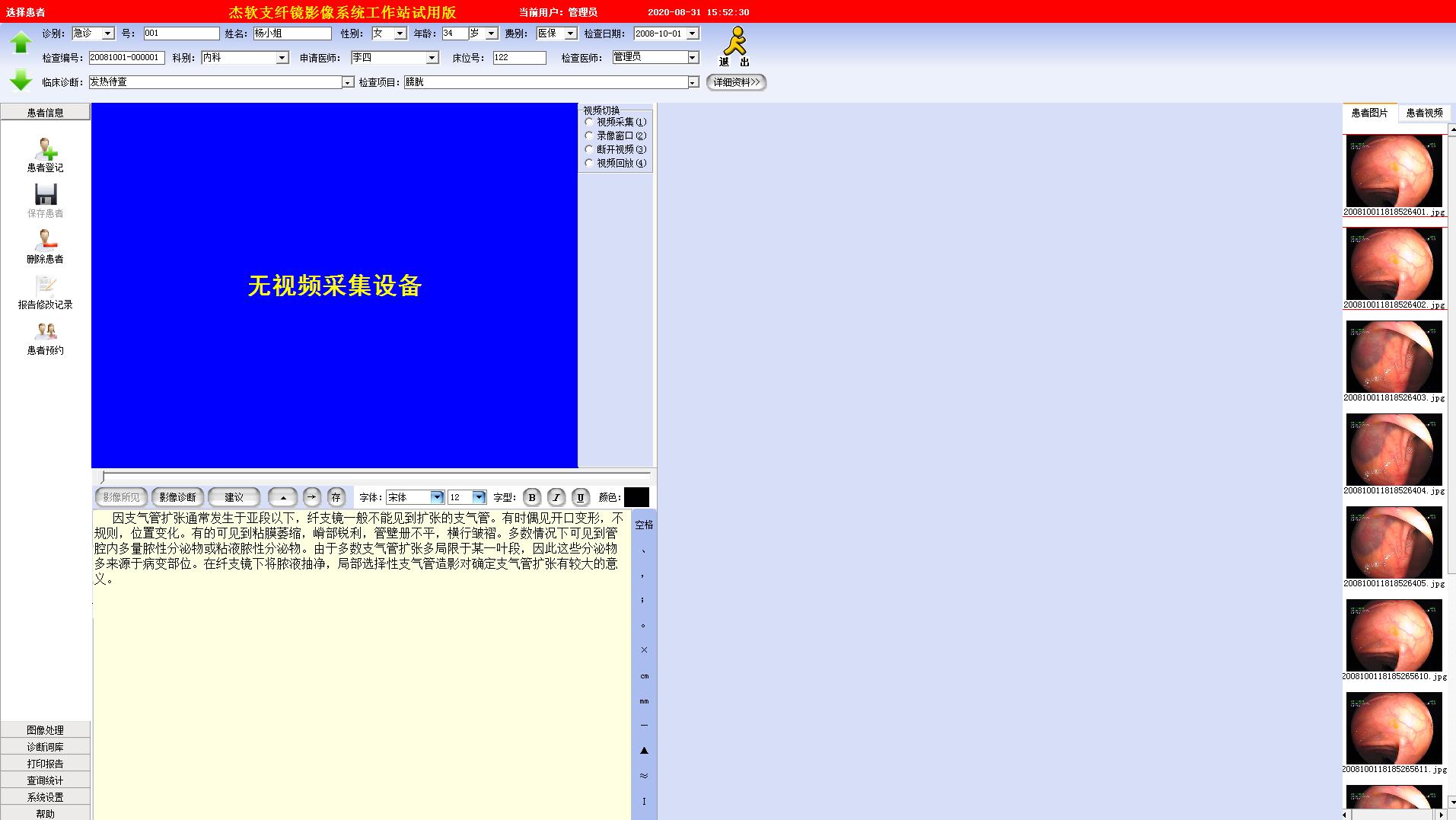 支纤镜影像系统工作站适用于所有生产厂家和型号的支纤镜及支气管镜等影像设备相链接。批量输入患者信息,能以表格的方式显示病人的相关信息,显示待检病人或已检病人,可自订议检查的项目输入,使报告专业快捷,提高报告的实用性。常用输入法的打开及设置。
