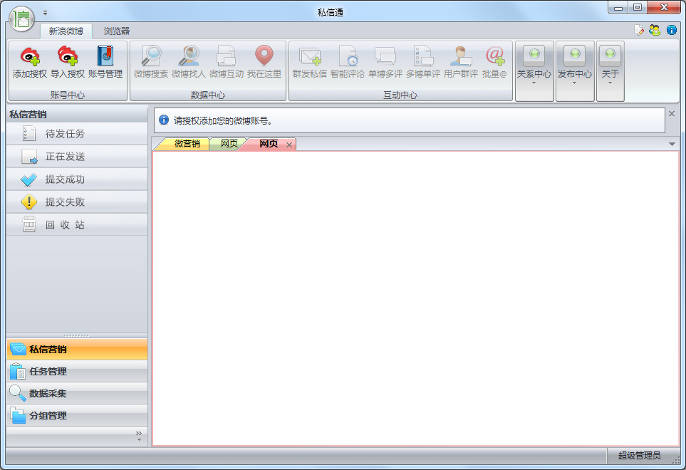 私信通新浪微博私信群发工具是一款专注于微博营销的软件,私信通集粉丝采集、私信群发、批量转发等多种功能于一身,帮助用户达到更好的营销效果。