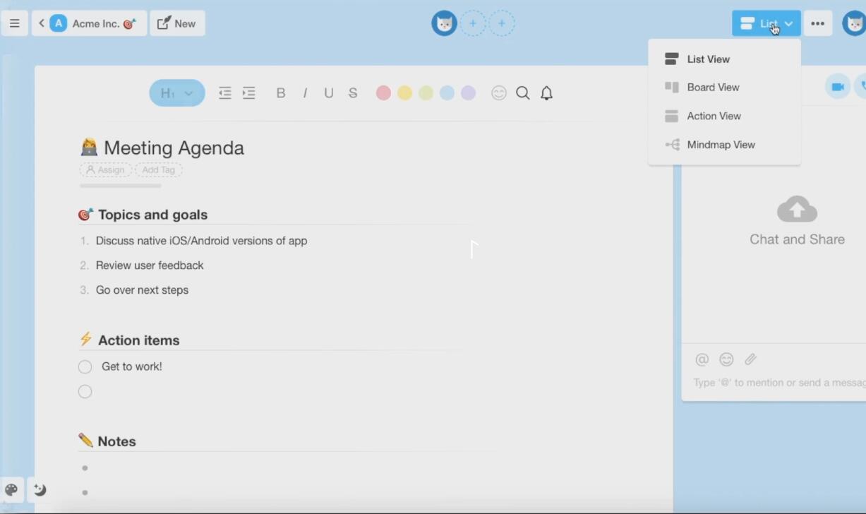 创建一个项目来捕获您的想法、团队目标和每周任务。要与您的团队协作,只需共享项目或邀请您的队友进入工作区。