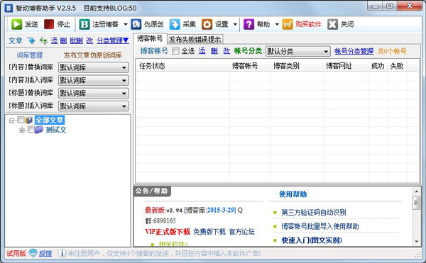智动博客助手是一款功能强大、操作简单、界面清新、操作简单、实用性强的博客推广软件,使用智动博客助手方便管理你的博客数据,还可以对发布的文章进行动态伪原创化(有利于搜索引擎收录文章) 通过历史记录功能可以过滤已发送的文章。