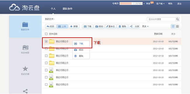 如果您安装了客户端,可以直接复制文件到淘云盘专用文件夹,系统会自动将文件同步到云端。