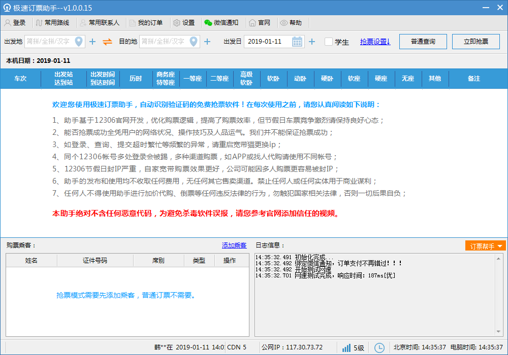 1、助手基于12306官网开发,优化购票逻辑,提高了购票效率,但节假日车票竞争激烈请保持良好心态;